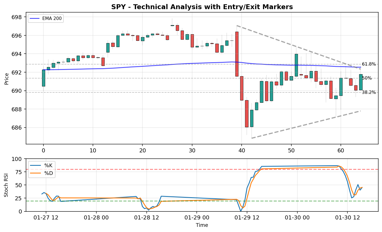 View charts with buy/sell markers showing exact entry points, take-profit targets (TP1, TP2), and stop-loss levels from recent alerts. Great for learning candlestick patterns!